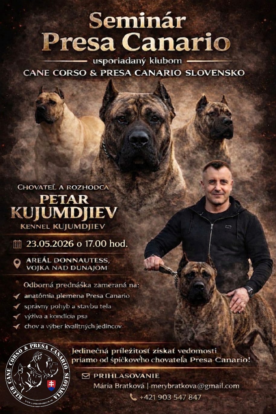 Klub Cane Corso & Presa Canario Slovensko vás pozýva na odborný seminár venovaný plemenu Presa Canario, ktorý povedie uznávaný chovateľ a rozhodca Petar Kujumdjiev (Kennel Kujumdjiev).